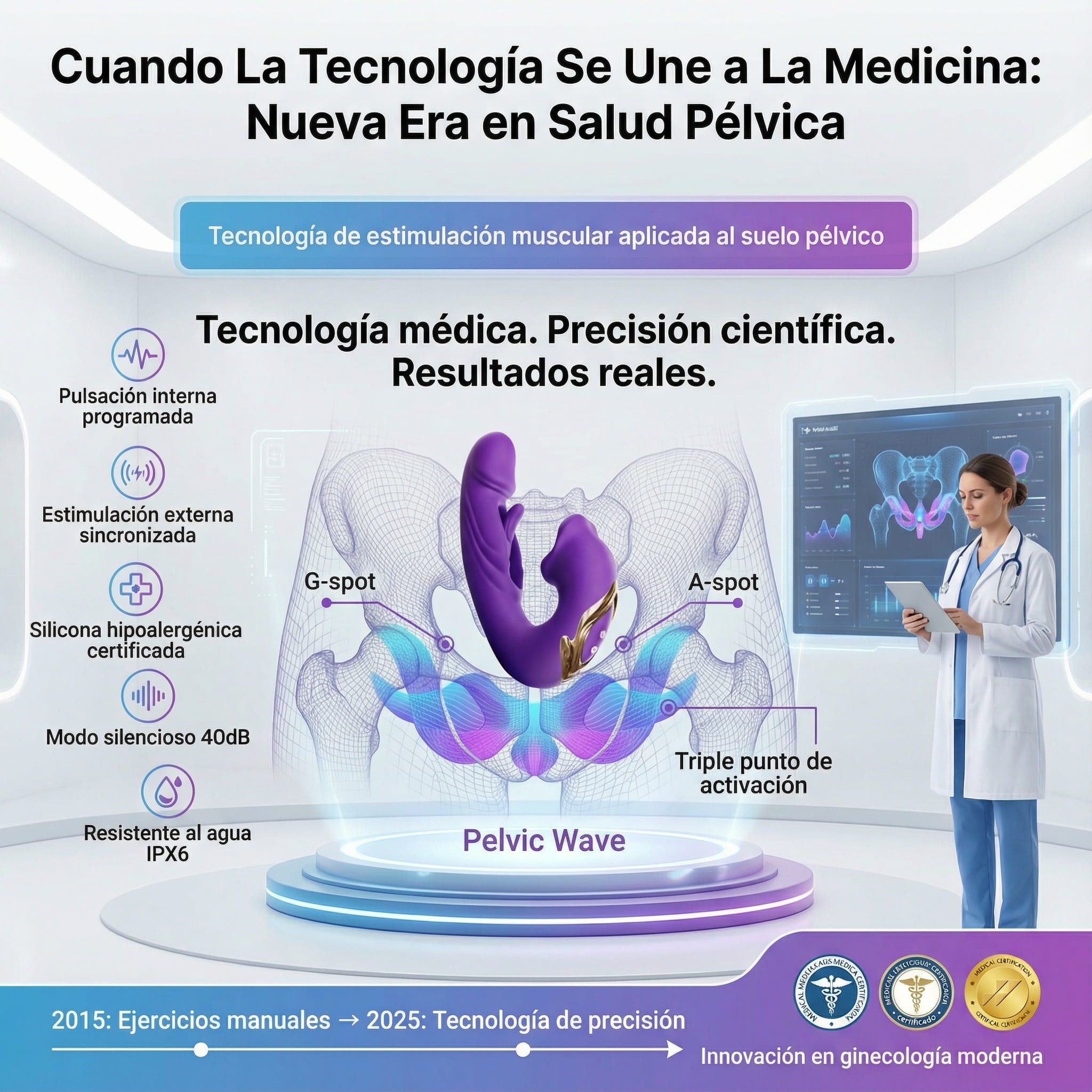 PelviWave combina estimulación profunda, vibración inteligente y diseño ergonómico, atacando el problema que otros productos ignoran: